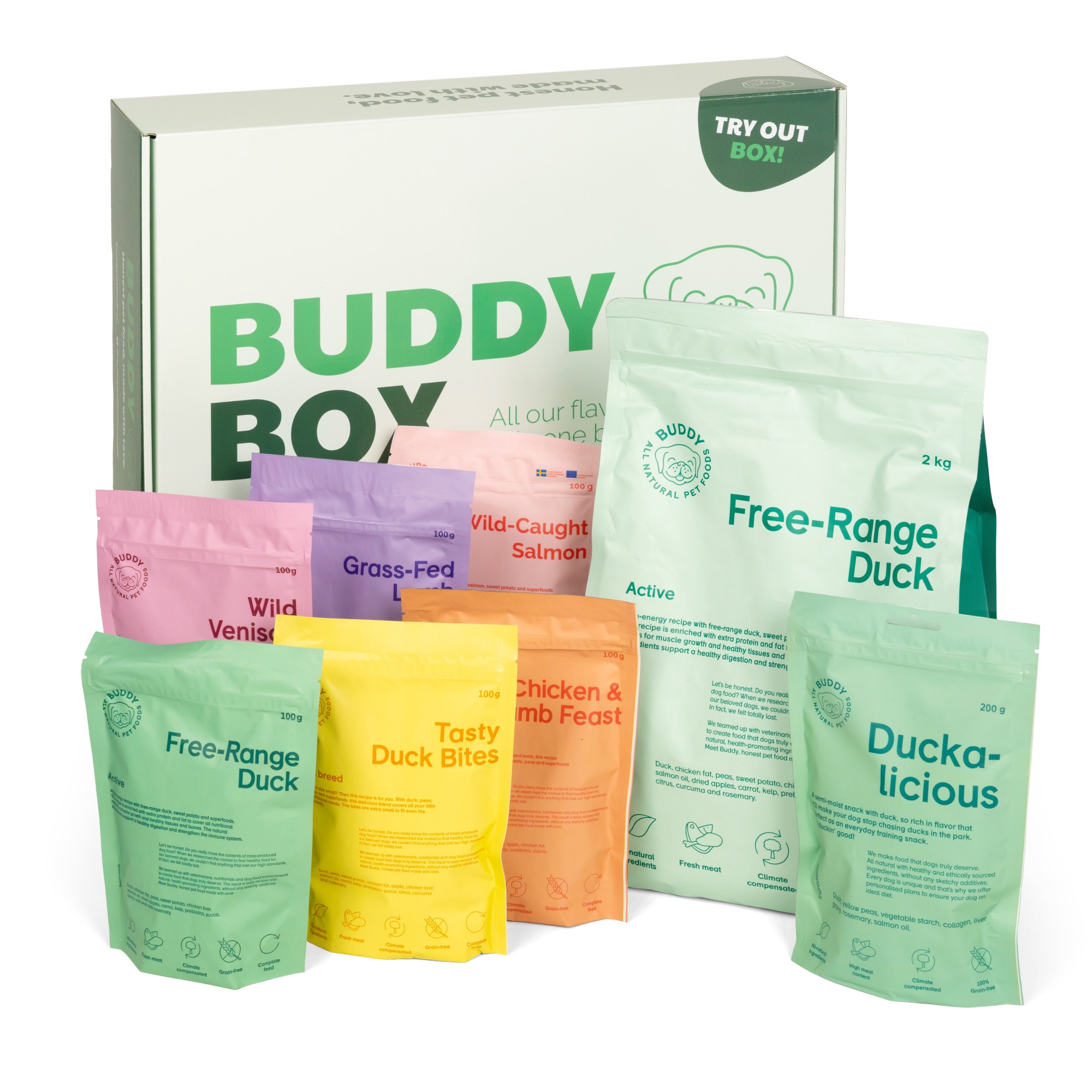 Möchten Sie Buddy ausprobieren? Bestellen Sie einmalig eine Try-out-Box mit Trockenfutter und Snacks. Diese Probierbox ist die beste und günstigste Möglichkeit, unsere natürliche Hundenahrung kennenzulernen.
